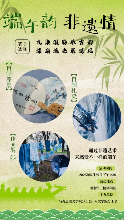 端午临仲夏,非遗绽华光。为传承中华优秀传统文化,让老师们深入体验端午习俗与非遗魅力,增进教职工之间的沟通交流,丰富教职工精神文化生活,milan米兰体育官网分工会与人文学院分工会联合开展“端午韵・非遗情——扎染溢彩承古韵,漆扇流光展遗风”庆端午主题活动,现将相关事宜通知如下。