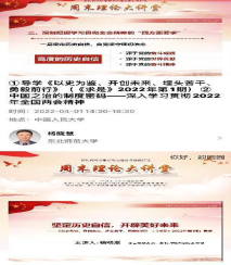 2022年4月1日下午,milan米兰体育官网组织思政课教师线上收看教育部“周末理论大讲堂”专题辅导报告集体备课会。全国政协委员、教育部全国高校思政课教学指导委员会主任委员、东北师范大学党委书记杨晓慧做了导学《以史为鉴、开创未来、埋头苦干、勇毅前行》(《求是》2022年第1期)和“中国之治的制度密码—深入学习贯彻2022年全国两会精神”专题辅导报告。