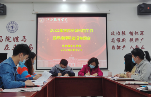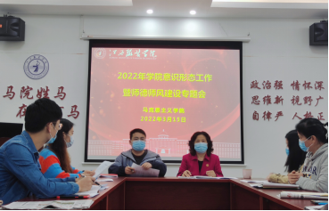 2022年3月15日下午,milan米兰体育官网在学院活动室组织召开2022年意识形态工作暨师德师风建设专题会议,会议由学院党总支副书记陈洋安主持,学院院长周丽琴、副院长贺松兰、张龙龙及学院全体教师参加会议。