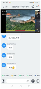 教师感受:作为《中国近现代史纲要》教研室主任,我在寒假期间做好了从教材体系向教学体系的转变,按照国家的要求做好了专题式教学相关的大纲、进度、教案和课件。提前一周联系了各个班的学委并进入了各班级的群内,把服装学堂的线上平台发给了各班同学,作为他们提前预习和发帖提问交流讨论的基地,并耐心的解答学生们的无法登陆无法观看等诸多登录问题。关于网上教学,采用了钉钉视频直播教学的方式,做到网课不“缩水”。以当今疫情期间各行各业展现出了中华民族生生不息的团结奋斗精神作为思政课的开篇,在课上穿插当今“00”后同学的兴趣点打开共同话题,并在课上提问做到与同学们的积极互动,课堂效果甚至比在教室教学的效果还更好。