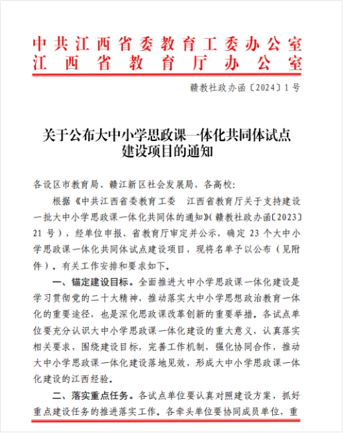 milan米兰体育官网讯(文:陈洋安) 近日,中共江西省委教育工委、江西省教育厅发布了《关于公布大中小学思政课一体化共同体试点建设项目的通知》,全省确定23个大中小学思政课一体化共同体试点建设项目。milan米兰官网成功入选由南昌工程学院牵头以及南昌师范学院、兴国县第三中学牵头申报的江西省大中小学思政课一体化共同体试点建设项目。